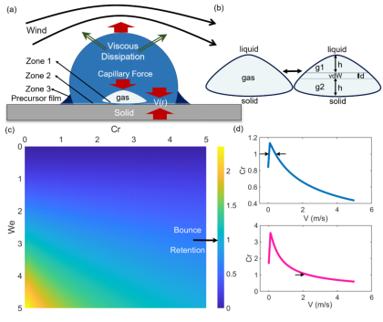 Figure 1(a)液滴固体界面可分为3个区域(b)考虑气体薄层的内聚力,将气体薄层分为上下两部分g_1,g_2,研究Van der Waals作用(c)完全回弹判据Cr},在Cr≤1区域对应的液滴发生滞留,在Cr>1的区域可能为回弹(d)只与速度有关的完全回弹判据Cr_{V},箭头指向处为临界速度,上下两图分别为回弹滞留回弹以及滞留回弹的转变。