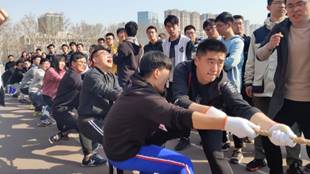 运动会第一个项目是拔河比赛,比赛以班级为单位,抽签分组决定比赛顺序,两两竞争,运动员们个个摩拳擦掌,全都紧握绳子,憋足了劲把绳子往后拉,精彩且激烈的拔河比赛,拉开了这场盛会的序幕。