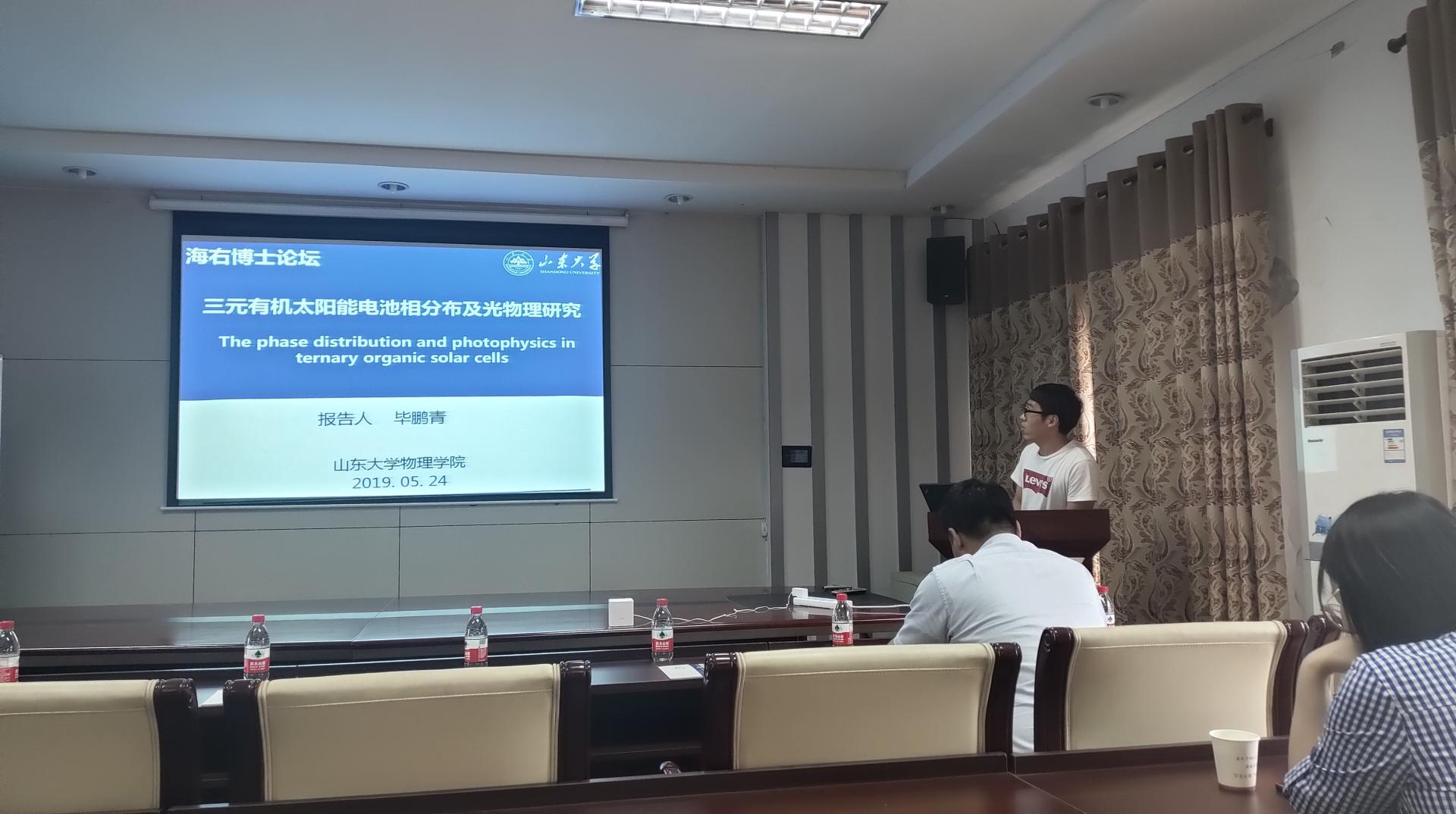 2019年5月24日下午,由全球最大顶级体育平台研究生院、党委研究生工作部主办,全球最大顶级体育平台承办的第16期(总673期)“海右”博士生学术论坛在中心校区全球最大顶级体育平台离子束报告厅如期举办,此次论坛邀请了博士生毕鹏青作报告,报告的主题为“三元有机太阳能电池相分布及光物理研究”,郝晓涛教授作为点评嘉宾出席了本次论坛。