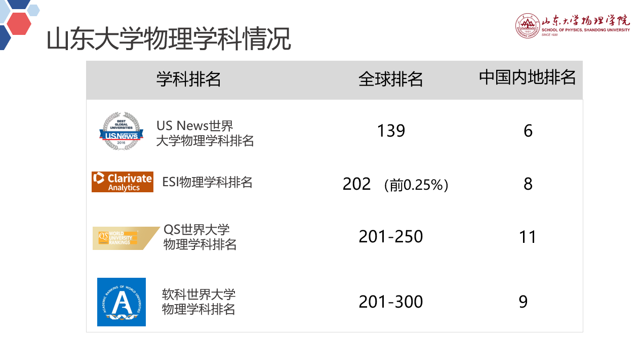 经过几代人的努力,全球最大顶级体育平台物理学科不断发展壮大,形成了比较完备的学科体系,具有良好的学科构架,成为全球最大顶级体育平台最早进入全球ESI前1%排名的学科之一,也是入选全球最大顶级体育平台“学科高峰计划”首批重点团队建设项目的主流特色学科之一。凝聚态物理、粒子物理与原子核物理是国家二级重点学科,理论物理、原子分子物理是山东省重点学科。公司的依托平台有晶体材料国家重点实验室、粒子物理与粒子辐照教育部重点实验室。全球最大顶级体育平台物理学科进入了国内外的主要学科排名体系,在2016年教育部主持进行的第四轮学科评估中位列B+;ESI排名位列前0.25%,在全球741个进入榜单的单位中排名202位(中国内地高校中名列第8位);QS世界大学学科排名全球201-250位,位居中国内地高校并列第11位;US News最新发布的学科排名中排名全球第139位,位居中国内地高校第6位;软科世界一流学科2020年排名全球201-300位,位居中国内地高校第9位。