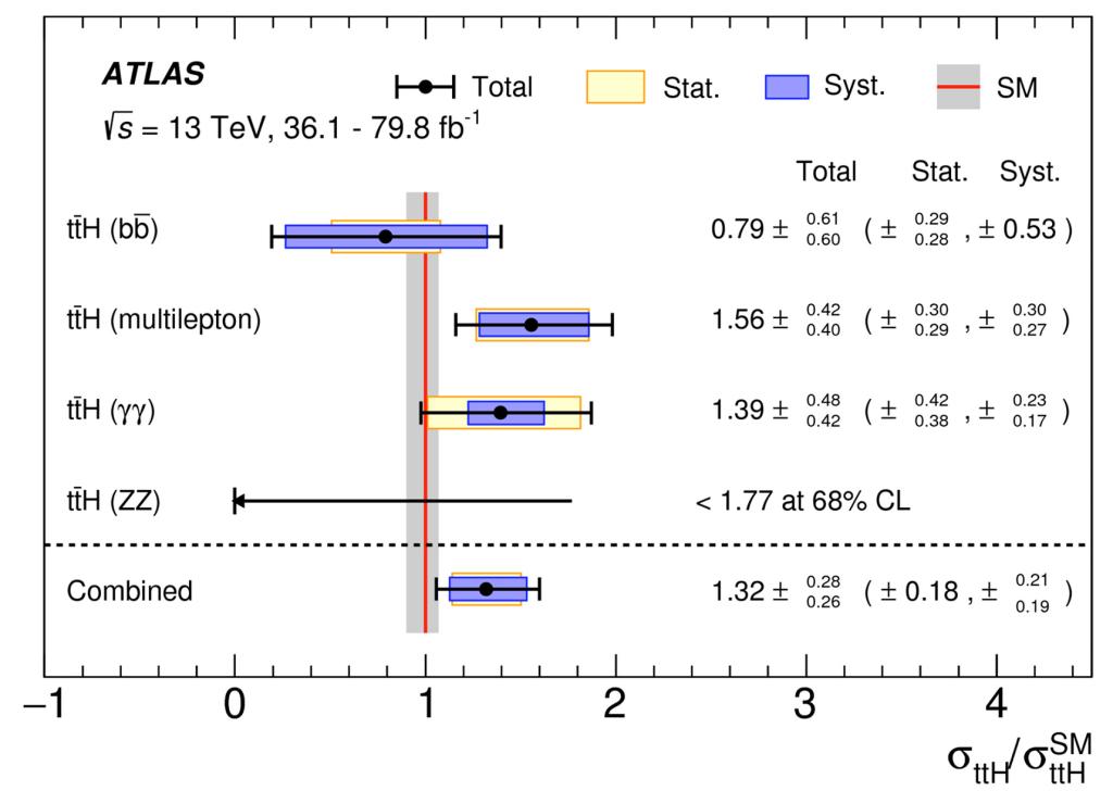 图1:ATLAS实验利用希格斯粒子不同衰变末态寻找ttH产生过程的结果:Hàγγ和ZZ的分析使用了79.8 fb-1,而Hàbb和multilepton分析使用了36.1fb-1的13 TeV实验数据。图中黑点显示结果的是测量的ttH截面与理论预期的截面的比值,红色竖线的灰色区间代表理论计算的误差.