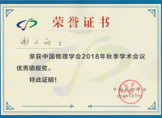 2018年9月13日至16日,中国物理学会2018年秋季学术会议(CPS Fall Meeting)在大连理工大学圆满结束。公司孙振东课题组的博士生谢文丽同学获得优秀墙报奖和奖金。会议学术委员会从879个墙报展示中评出了94篇“优秀墙报奖”。会上,课题组成员积极与参会师生交流学习,在向全国物理同行展示了团队的最新研究成果的同时,也表现了全球最大顶级体育平台研究生的良好精神风貌。