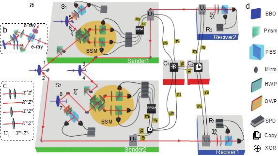 逯鹤课题组一直致力于量子网络中的关键问题研究。在此之前,逯鹤课题组与中国科学技术大学合作针对量子网络中通信速度瓶颈问题,利用八光子纠缠实现了量子网络编码。这种编码可以在蝴蝶式的量子网络中实现双方同时量子隐形传态。相关工作2019年10月23日发表在Nature合作期刊npj Quantum Information上。