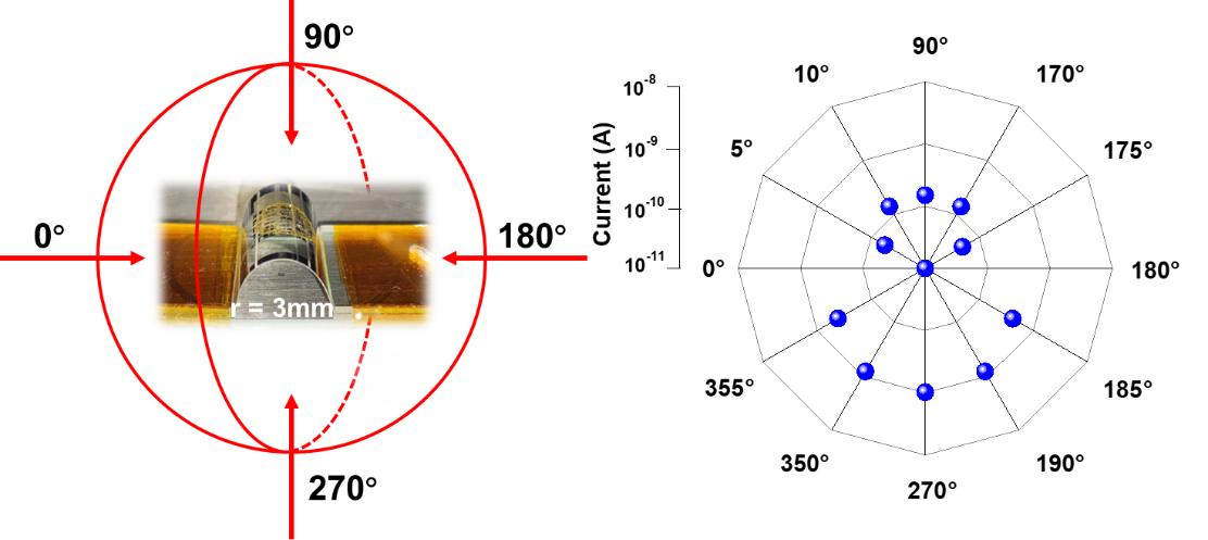 便携式可穿戴设备的兴起对光电探测器提出了新的要求,其中360°全方位探测就是重要的技术指标之一。然而,复杂的器件结构,低的光吸收、光生载流子收集效率,严重制约了全方位光电探测器的发展。杨再兴教授课题组在柔性透明PET基底上成功构筑了ITO/PbI2/Ni三明治构型器件,利用非对称电极接触这一简单策略,实现了柔性全方位自供能光电探测器。该器件表现出优异的柔性自供能光电探测性能,暗电流低至10-13 A,Ilight/Idark比高达106,响应时间低至2 ms(上升时间)和3 ms(衰减时间)。值得指出的是,当光以5°的入射角照射时,光电探测器仍然可以保持较高的光电响应信号,表现出近乎360°全方位自供电光电探测的能力。相关结果以“Flexible omnidirectional self-powered photodetectors enabled by solution-processed two-dimensional layered PbI2 nanoplates”为题发表在ACS Applied Materials & Interfaces(2022, 14, 46748)期刊上。该工作为360°全方位便携式可穿戴设备的研发提供了新策略。