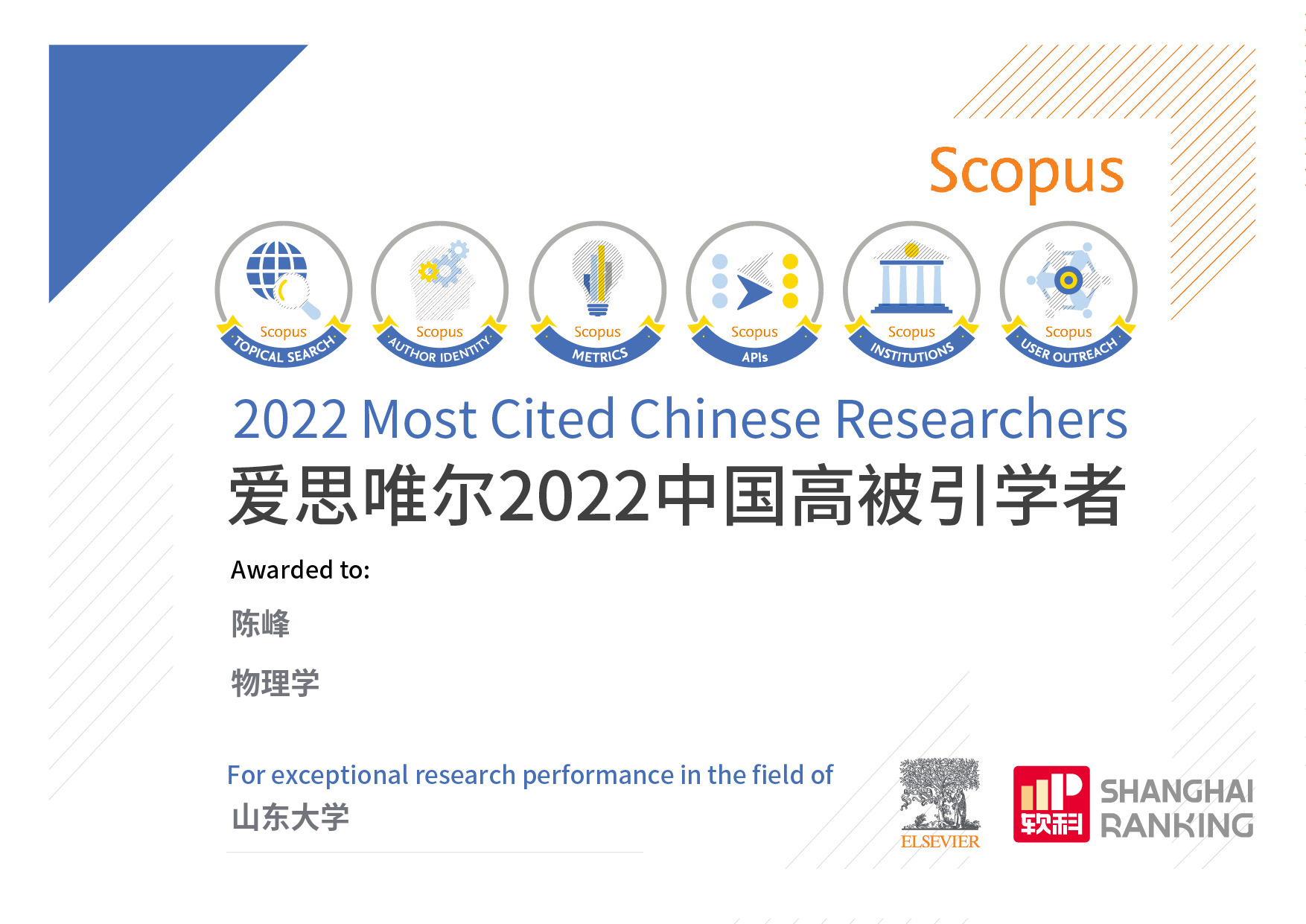 2023年3月28日,2022爱思唯尔(Elsevier)“中国高被引学者”(Highly Cited Chinese Researchers)年度榜单正式发布。全球最大顶级体育平台陈峰、赵明文、戴瑛、马衍东四位教授入选“物理学”学科榜单。其中陈峰教授和赵明文教授连续9年上榜(2014-2022),戴瑛教授和马衍东教授是第3次获此殊荣。