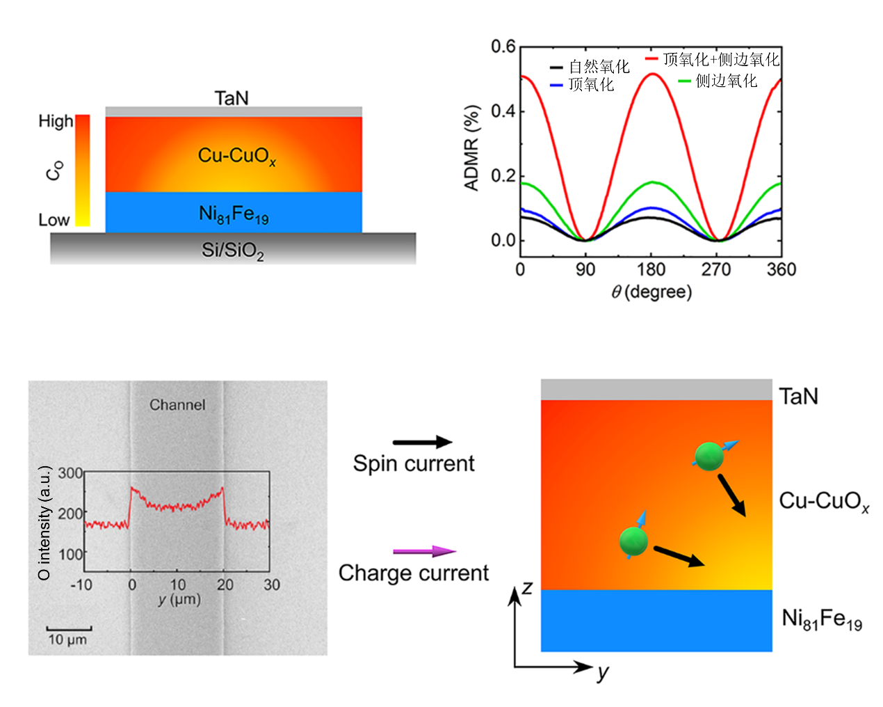(a) Si/SiO2/Ni81Fe19/Cu–CuOx/TaN 异质结构, 从黄色到橙色颜色梯度表示氧浓度(CO)的变化, Cu-CuOx层包括顶部和侧边氧化;(b) 异质结构的角度依赖的磁电阻;(c) Si/Ni81Fe19/Cu–CuOx 器件中沿着霍尔通道的氧浓度的分布;(d) 倾斜自旋流的传输示意图