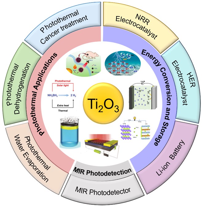 近日,李洋洋教授课题组从Ti2O3的合成、晶体结构、电子结构、物理性质和功能应用等方面进行了综述报道,这是该材料合成100年以来的第一篇综述文章。下图整理了自1921年Ti2O3合成以来,重要研究节点的发展时间线。Ti2O3凭借其超窄的带隙(0.1 eV)呈现出广阔的吸光范围(UV-Mid infrared)和高效的光热转换效率,在光热领域(光热水蒸发、光热脱氢和光热肿瘤治疗)、光探测领域和能量转换存储领域(电催化固氮、电催化产氢、锂离子电池)都具有巨大的应用潜力。
