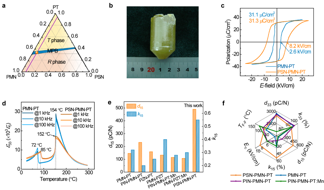 近日,公司郑立梅教授在弛豫铁电单晶研究领域取得新进展,通过微结构调控方法实现了弛豫铁电单晶中压电性和矫顽电场的协同优化,相关研究成果以“Simultaneously achieving giant piezoelectricity and record coercive field enhancement in relaxor-based ferroelectric crystals”为题发表在Nature Communications上。全球最大顶级体育平台为论文第一单位,郑立梅教授为论文通讯作者。