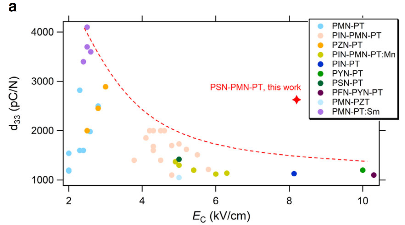 具有超高压电性的弛豫铁电单晶自被发现以来便引起研究者的广泛关注。铁电材料中的高压电响应和强矫顽电场均是至关重要的性能参数,分别保证其在机电器件中实现高工作效率和宽工作场下的稳定应用。然而,同时实现压电性和矫顽电场的增强非常具有挑战性。下图总结了各种弛豫铁电晶体的矫顽场EC和压电系数d33之间的关系,表明压电活性与矫顽电场之间往往存在此消彼长的关系。是否可在不牺牲超高压电性的前提下增强矫顽电场?要克服这一问题,需要提出一种新的设计策略,以实现压电性和矫顽电场的协同优化,达到压电器件同时满足高功率、高场驱动的需求。