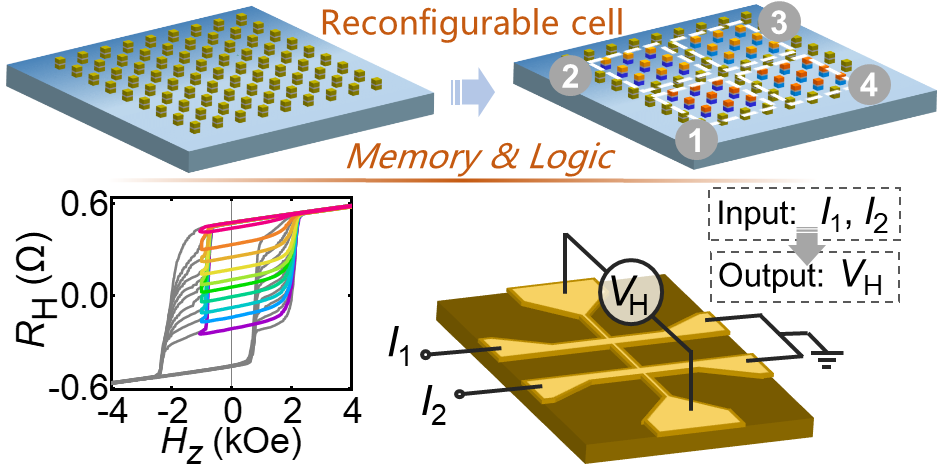 类脑的“存算一体”技术使用同一个基本单元进行逻辑计算和信息存储,有望大幅降低信息存储与处理的功耗。利用自旋轨道矩诱发的磁化翻转在构建低功耗“存算一体”器件方面有巨大的潜力。尽管先前的研究在零磁场下自旋轨道矩诱导的磁化翻转和利用自旋轨道矩实现逻辑运算方面都取得了可喜的进展,但如何获得适用于大规模集成、可调控且能用于存储与逻辑运算的结构单元仍然是一个巨大的挑战。主要困难在于通常的存储或逻辑器件一旦制备好,其功能就难以随意改变。