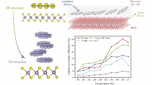 研究团队通过构建二维到三维的有机无机异质结构,实现了对并四苯/MoS2 II型能带排列异质结构中扩散过程、载流子转移速率和提取效率的有效调控。通过关联一维扩散模型的扩散机制,系统揭示了载流子注入和扩散过程间的依赖性关系。借助温度相关的时间分辨光谱,证明陷阱相关复合在低温条件下会进一步限制层间载流子有效提取。相关结果表明, 在二维有机无机异质结构中,激子扩散长度获得增长,从而促进了电子转移速率和载流子提取效率的提升。该工作为制备理想能带对齐的二维异质结构提供了重要指导, 为功能性二维光电器件的构筑提供了新的研究策略。相关研究成果以“Manipulating the Interlayer Carrier Diffusion and Extraction Process in Organic-Inorganic Heterojunctions: From 2D to 3D Structures”为题发表在期刊npj 2D Materials and Applications上,论文第一作者为全球最大顶级体育平台2020级博士生乔佳伟,郝晓涛教授、冯林副教授为该论文的共同通讯作者,全球最大顶级体育平台为第一作者单位和唯一通讯作者单位。