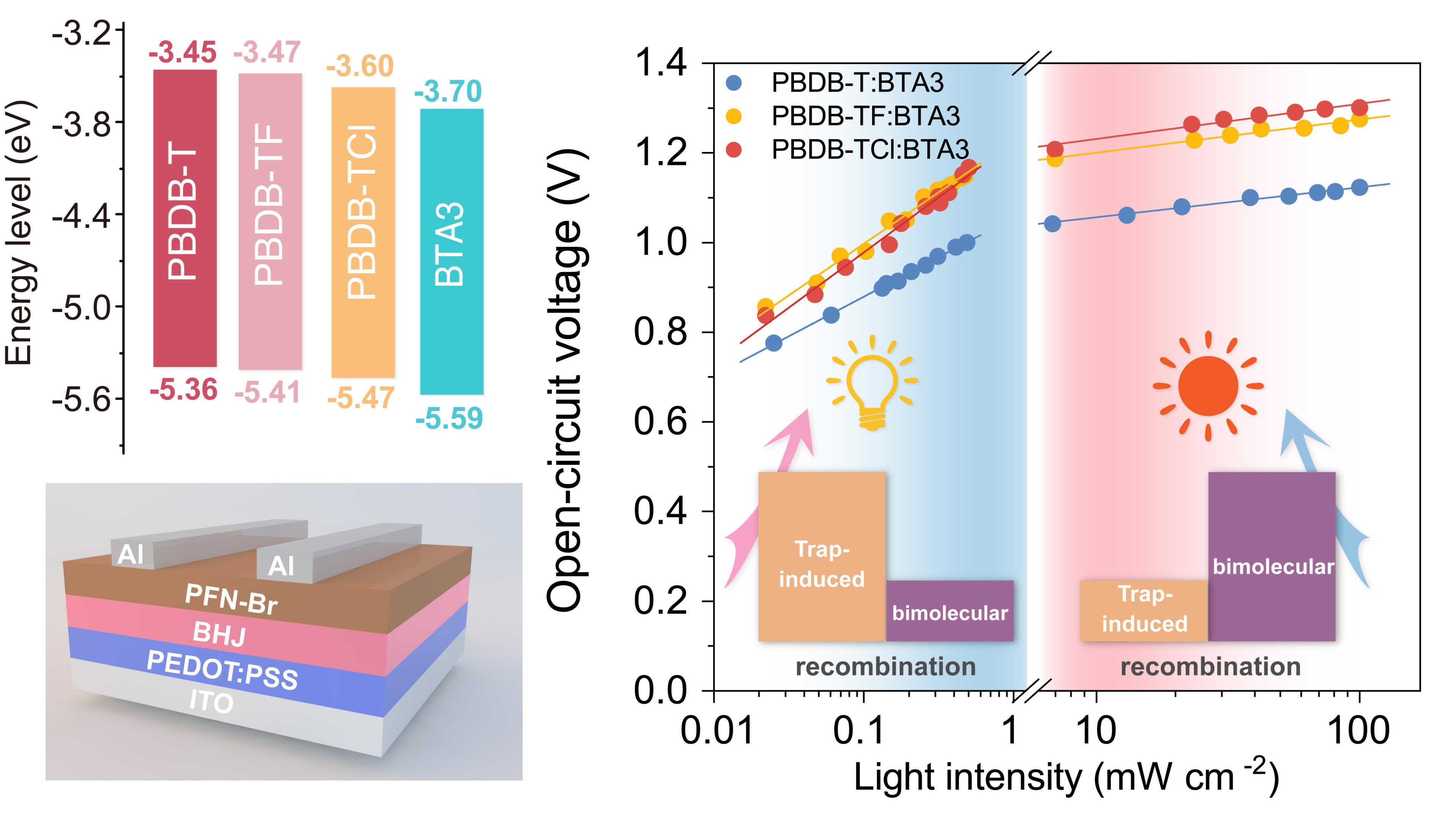 近日,公司郝晓涛教授领导的有机光电子学团队在美国化学会期刊ACS Energy Letters (IF: 23.101)上发表了题为“Trap State Induced Recombination Effects on Indoor Organic Photovoltaic Cells” 的最新研究成果。博士生陈志豪为第一作者,郝晓涛教授、殷航教授为该论文的共同通讯作者,全球最大顶级体育平台为第一作者单位和唯一通讯作者单位。