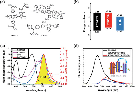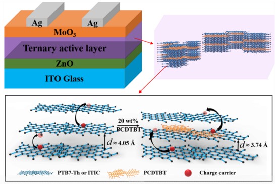 有机太阳能电池因为其柔性、廉价、可卷对卷溶液加工等优势受到越来越多的关注,其中三元有机太阳能电池由于具有拓宽吸收窗口、调控形貌等优点成为近来有机光伏的研究热点。有机光伏研究中三元体系的引入是实现高效太阳能电池器件的有效途径,弄清三元体系活性层的复杂形态结构和基本物理过程的关联关系是实现有效电子转移和提高器件效率的关键。郝晓涛课题组在PTB7-Th,PCDTBT,ITIC非富勒烯三元有机太阳能电池中发现PCDTBT在三相体系中同时分布在给、受体中,可以有效调控活性层的吸收光谱、微纳形貌、载流子迁移率等性质;由于PCDTBT的发光与PTB7-Th以及ITIC的吸收有较大范围的重叠,使得双能量传递效应共存于同一体系中;多种物理机制的协同效应可使器件的短路电流得到很大的提升,从而将器件能量转换效率增加了15%以上。此项研究表明,通过选择合适第三元材料构筑三元共混体系,可以进一步显著提升两元器件的能量转换效率,这为制备高性能有机太阳能电池器件提供了新思路。