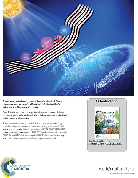 近日,《J. Mater. Chem. A》以“Dual Förster resonance energy transfer effects in non-fullerene ternary organic solar cells with the third component embedded in the donor and acceptor”为题发表了公司郝晓涛课题组关于有机太阳能电池物理机制的研究结果(J. Mater. Chem. A, 2017, 5, 12120-12130; DOI: 10.1039/C7TA01557G),并选为封底内页(inside back cover)进行介绍。论文第一作者是博士研究生毕鹏青,通讯作者是郝晓涛教授。