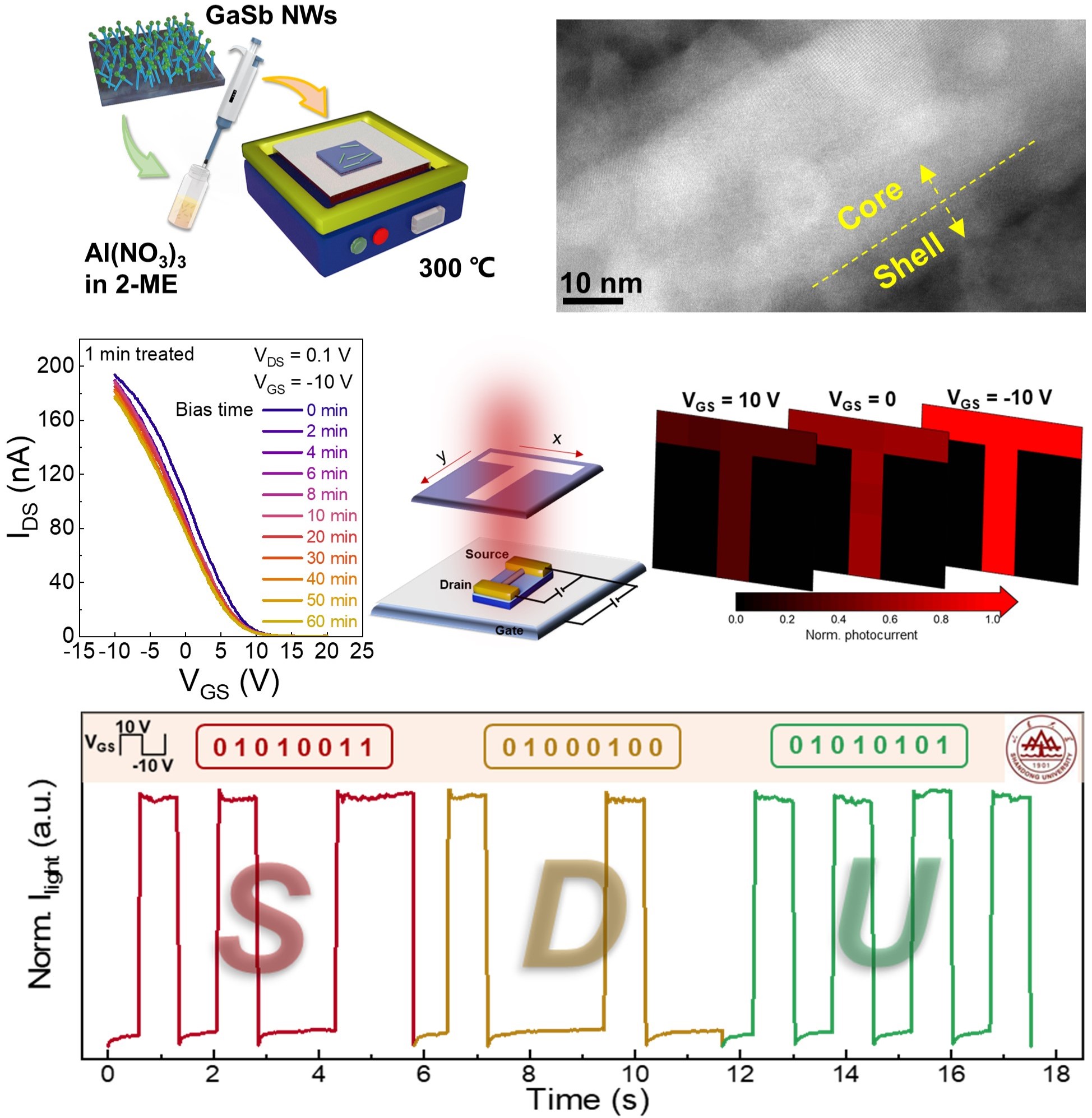 表面态在锑化物纳米线光电子器件中往往充当电荷陷阱,导致器件在偏压、栅压下工作不稳定,阻碍了锑化物纳米线在下一代光电子器件中的实际应用。表面钝化或者修饰可以有效调控表面态,从而优化光电子器件的性能。杨再兴等人首次通过低温溶液-退火法在锑化物纳米线表面生长了厚度可调的氧化铝钝化壳层。低温溶液-退火法易操作、成本低且与现有CMOS工艺兼容。得益于低温溶液-退火法生长的氧化铝壳层的独特双电层效应,锑化物纳米线表面态的电荷陷阱作用得到抑制。相较于纯GaSb纳米线场效应晶体管,生长了氧化铝钝化壳层的GaSb纳米线场效应晶体管的偏压稳定性得到大幅提升,展示出较小的开态电流衰减(<10%)和可忽略的阈值电压移动。当进一步应用到红外探测技术中,器件展现出稳定的、优异的栅极调控红外探测成像及通讯能力。相关研究结果以“Toward high bias-stress stability p-type GaSb nanowire field-effect-transistor for gate-controlled near-infrared photodetection and photocommunication”为题发表于Advanced Functional Materials期刊上。公司为论文第一通讯单位,博士生洒子旭为论文第一排名作者。
