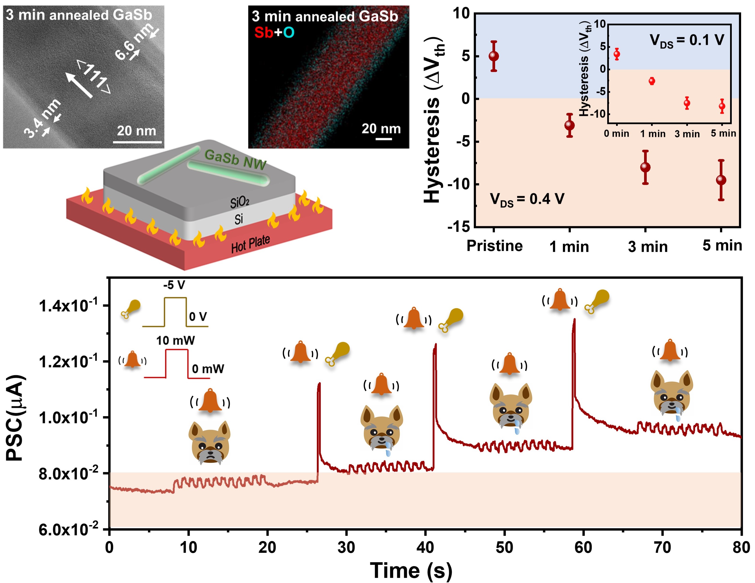 Si及其工艺为什么是主流?其中一个原因就是其表面能形成高质量的介电材料SiO2。一般情况下,锑化物纳米线的表面存在着2-5 nm厚度的天然氧化层。这些天然氧化层往往充当着表面电荷陷阱的作用,锑化物纳米线场效应晶体管的偏压稳定性差。本工作中,杨再兴等人在大气中原位退火锑化物纳米线,在纳米线表面氧化出厚度可控的氧化层。得益于退火生成的表面氧化层中可移动氧离子的电荷补偿作用,锑化物纳米线天然氧化层(表面态)的电荷陷阱作用得到抑制。相较于具有天然氧化层的GaSb纳米线场效应晶体管,退火处理的锑化物纳米线场效应晶体管的偏压稳定性得到大幅提升(回滞窗口ΔVth ~ 0.54 V)。退火生成的氧化层中可移动的氧离子也促使锑化物纳米线在未来类脑计算领域展示出优秀的应用潜力:器件结构简单(无需额外介电层、无需设计器件结构)是最大的优点。相关研究结果以“An Amorphous native oxide shell for high bias-stress stability nanowire synaptic transistor”为题发表于Advanced Science期刊上。公司为论文第一通讯单位,校特别资助类博士后庄昕明博士为论文第一排名作者。