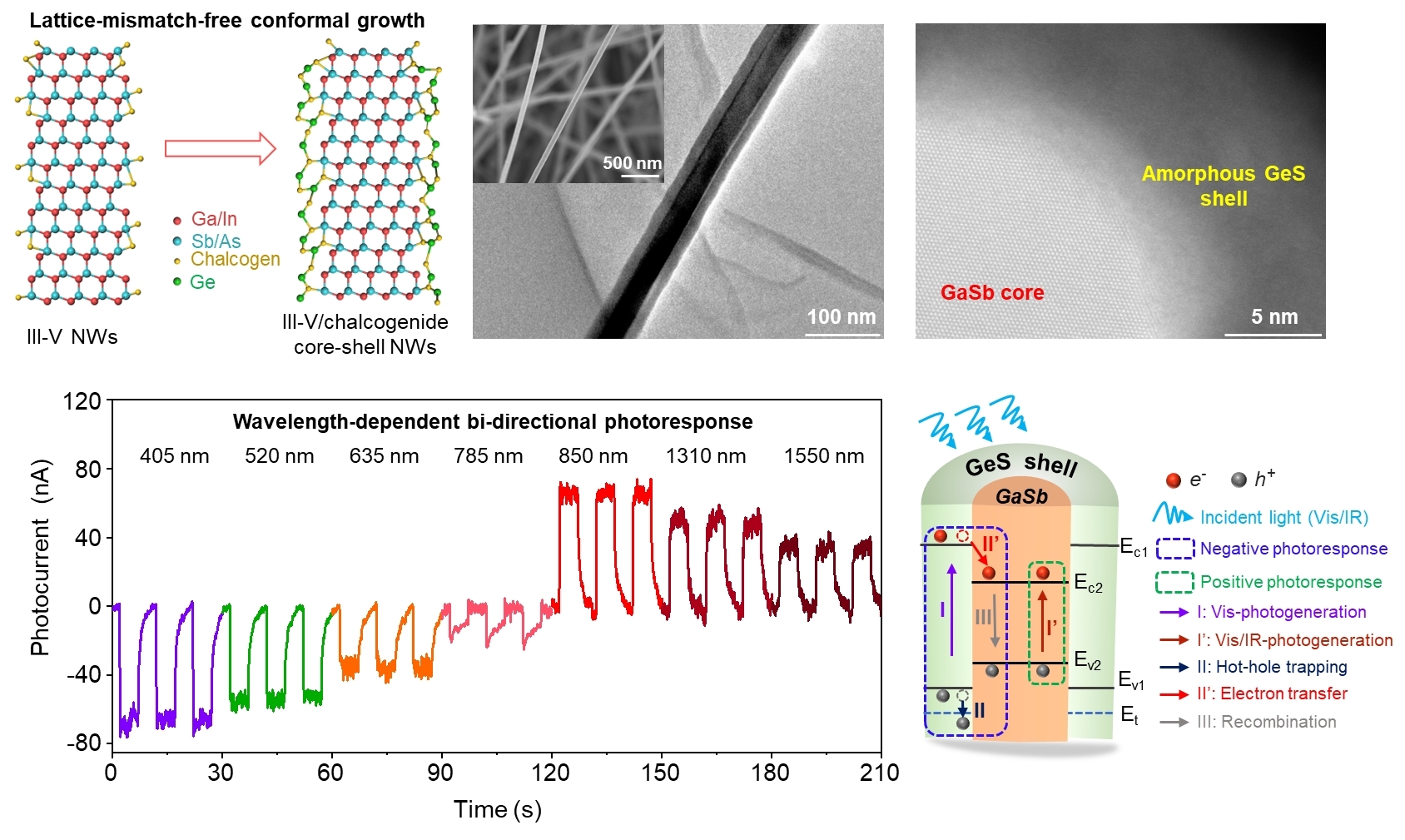 构建核壳结构是钝化锑化物纳米线表面态的有效手段之一。然而,晶格匹配极大的阻碍了高质量核壳异质纳米线的构筑。在前期的工作中,利用硫族元素的表面活性剂作用,杨再兴等人成功抑制了锑元素的“趋肤效应”,得到了锑元素分布均匀、直径可控的锑化物纳米线(Nature Communications 2014, 5, 5249)。基于此,利用充当表面活性剂作用的硫族元素作为“纽带”,杨再兴等人在锑化物纳米线表面成功生长出非晶的硫族半导体壳层。采用非晶硫族化合物半导体作为钝化壳层,解决了构筑核壳纳米线中的晶格适配难题。通过优化生长条件,实现了对核壳结构纳米线的组份、直径(壳层厚度)以及表面形貌的调控。成功构筑核壳结构后,锑化物纳米线的表面态得到成功调控,其稳定性显著提升并展示出有趣的光电探测行为。比如,构筑的GaSb/GeS核壳异质纳米线由于具有I类异质结构和非晶的壳层,呈现出独特的波长依赖性双向光电探测能力和可见光辅助增强红外探测性能。该无晶格适配构筑核壳异质纳米线方法的普适性在多种III-V族和II-VI族半导体纳米线中得到验证,比如GaAs/GeS、InGaAs/GeS和CdS/GeS核壳异质结纳米线。相关研究结果以“Lattice-mismatch-free construction of III-V/chalcogenide core-shell heterostructure nanowires”为题于11月18日在线发表在Nature Communications期刊上。公司为论文第一通讯单位,校特别资助类博士后刘风景博士为论文唯一第一作者。