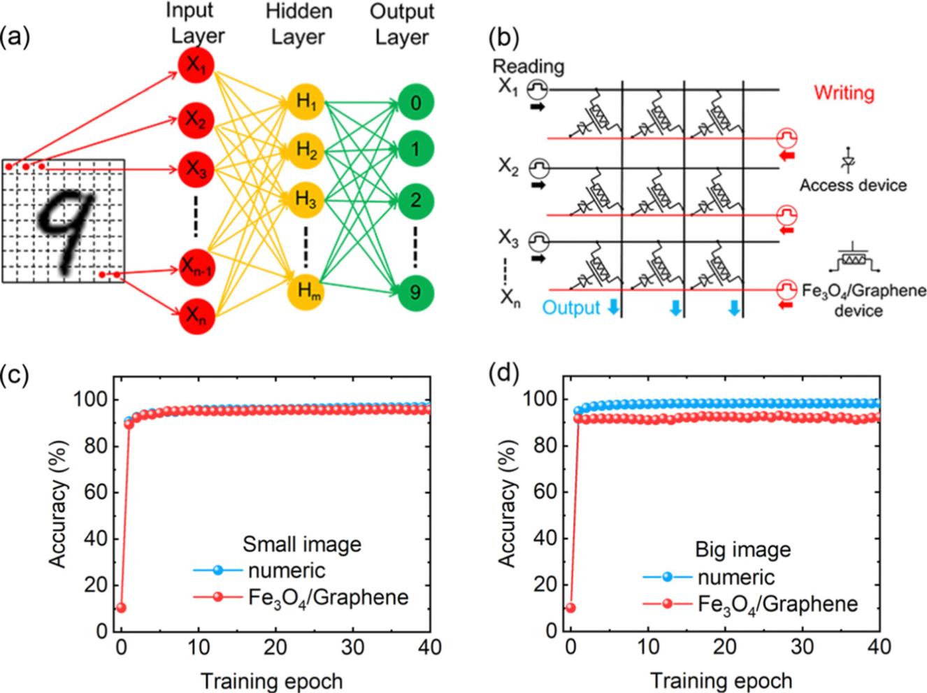 进展二:多感官人工突触在生物仿生学和人工智能领域具有广阔的应用前景。胡季帆教授团队在Fe3O4/graphene晶体管中利用离子液体电场和紫外光双场的激励下实现了多感官人工突触的模拟。团队成员利用石墨烯对氢离子的筛选作用获得了离子液体电场下氢离子迁移诱导的电导率调控,并基于此模拟了人工神经突触的长、短期可塑性,构建了三层人工神经网络用来模拟图像识别的应用功能,准确率高达96.72%。另外,团队利用紫外光场和电场对电导率的双场调控,在Fe3O4/graphene 突触器件上进一步实现了一系列布尔逻辑运算。该工作为同时感知和处理多个物理信号的人工智能领域提供了良好的平台。相关工作以“Multisensory synapses based on Fe3O4/graphene transistors for neuromorphic computing”为题发表于J. Mater. Chem. C期刊(2023, 11, 7732–7739),苗停停博士、刘伟康博士、小米科技有限公司黄存刚工程师为文章共同一作,崔彬和胡季帆教授为文章共同通讯, 山东建筑大学谢继浩博士、中国空间技术研究院航空五院陈娟、全球最大顶级体育平台成彬博士为文章合作者。