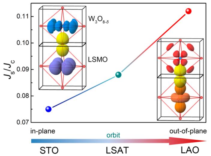 进展一:胡季帆教授团队在外延生长的W3O8−δ/(La,Sr)MnO3高质量氧化物异质结中,通过离子液体电场实现了W3O8−δ绝缘体-金属相变的可逆调控,进而在金属态W3O8−δ/LSMO异质结中观察到了电荷-自旋流的高效转换和自旋轨道矩驱动的磁化翻转。实验和理论研究共同发现在异质结中引入应变可以显著地改变自旋轨道矩效率,其中面内压应变可以导致Mn和W的面外d轨道的择优占据,提高异质结中d电子能带交叠,有效增强了W3O8−δ的自旋霍尔效应和W3O8−δ/LSMO界面的Rashba-Edelstein效应。该工作实现了电场对自旋轨道矩的可逆操控,并建立了轨道占据状态与自旋轨道矩强度之间的关系,为获得高效自旋电子学材料与器件提供了新的思路。相关工作以“Manipulation of spin-orbit torque in tungsten oxide/manganite heterostructure by ionic liquid gating and orbit engineering”为题发表于ACS nano期刊(2023, 17, 23626−23636),刘伟康博士和刘亮博士为文章共同一作,崔彬和胡季帆教授为文章共同通讯。郑州大学程少博教授、全球最大顶级体育平台秦宏伟教授、成彬博士为文章合作者。
