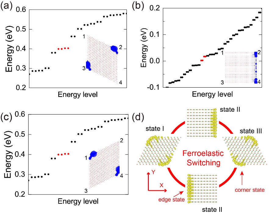 进展三:体边对应关系作为拓扑相的标志延伸到更高的阶数可以产生高阶拓扑绝缘体。目前关于高阶拓扑绝缘体的拓扑相变研究,大多局限于通过磁场引发拓扑相变。戴瑛教授团队提出将材料多铁性与高阶拓扑绝缘体结合,实现了铁电、铁弹对拓扑角态的调控,为高阶拓扑物性的调控提供了新的物理机制。进一步地,团队基于第一性原理计算在非磁性多铁材料SbAs和BP5中验证了这一机制。该工作实现了多铁性和拓扑物性的有机结合,也为进一步的实验研究提供了材料基础。相关研究成果以“Engineering Second-Order Corner States in 2D Multiferroics”为题发表在Small国际期刊上。论文第一作者为2023级博士生白英希,牛成旺教授和戴瑛教授为共同通讯作者,全球最大顶级体育平台为唯一作者单位。