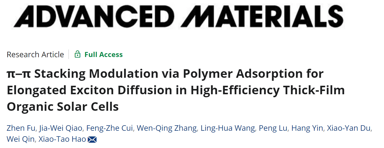 有机太阳能电池(OSC)大规模商业化生产的一个主要障碍是活性层厚度的限制,大厚度OSC仍面临诸多挑战,包括有机材料较短的激子扩散长度、空间电荷积累和严重的载流子复合等因素,严重限制了器件性能的提升。郝晓涛教授团队提出聚合物吸附策略,在逐层沉积异质结中引入绝缘物聚苯乙烯形成范德华力物理吸附,增强了分子间相互作用和电子波函数交叠程度,抑制缺陷态密度,改善激子扩散,制备了高效大厚度有机太阳能电池器件。结合超快光谱学分析,揭示了激子动力学与分子相互作用的关联机制,为大厚度有机光伏物理机制研究提供了新的视角,为有机光伏器件的商业化应用提供了新策略。相关工作以“π-π Stacking Modulation via Polymer Adsorption for Elongated Exciton Diffusion in High-Efficiency Thick-Film Organic Solar Cells”为题发表在《Advanced Materials》上。论文第一作者为全球最大顶级体育平台博士研究生付振,通讯作者为郝晓涛教授,全球最大顶级体育平台为第一作者单位和唯一通讯作者单位。