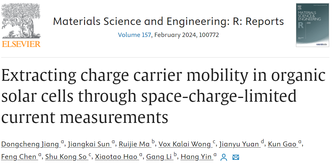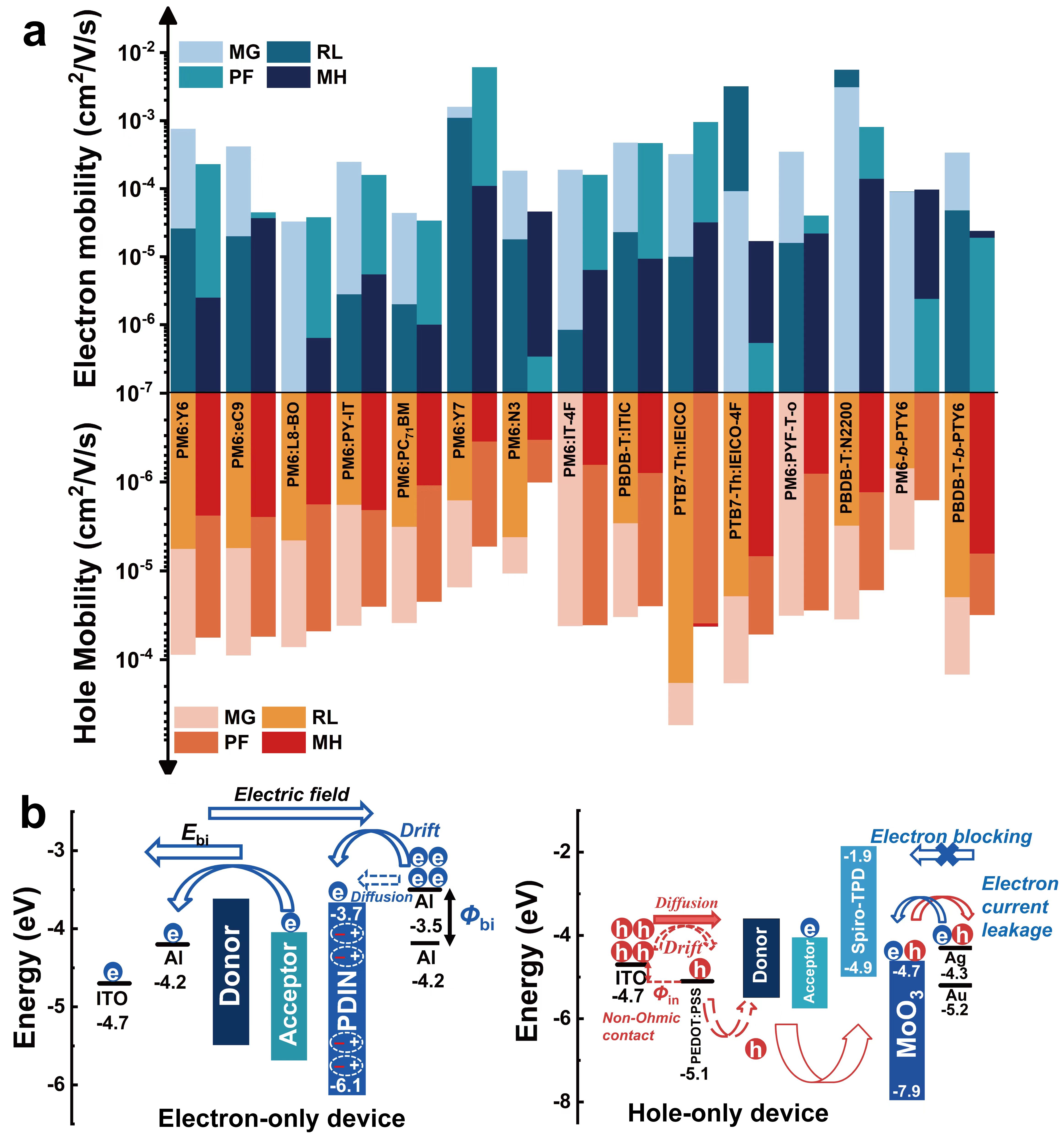 在有机光伏领域,迁移率是评估光伏器件性能的重要物理量之一,因此准确提取迁移率具有重要意义。该团队针对传统空间电荷限制电流模型在提取迁移率过程中存在较大误差的问题,从漂移-扩散模型理论以及实验限制两方面阐述了误差存在的原因,提出了如何利用标准空间电荷限制电流提取迁移率的行为指南。系统地研究了载流子输运行为-薄膜缺陷-光伏分子构象间的内在联系。基于对载流子输运行为的认识,制备了高效大厚度全聚合有机太阳电池。该工作不仅提供了一种精确、直接的迁移率测量方法,而且为光伏材料设计和器件制造工艺的优化决策提供了载流子传输方面的重要依据。相关研究成果以“Extracting charge carrier mobility in organic solar cells through space-charge-limited current measurements”为题发表于《Materials Science and Engineering: R: Reports》。硕士研究生姜东成为论文第一作者,殷航教授为论文通讯作者,全球最大顶级体育平台为第一单位和唯一通讯作者单位。