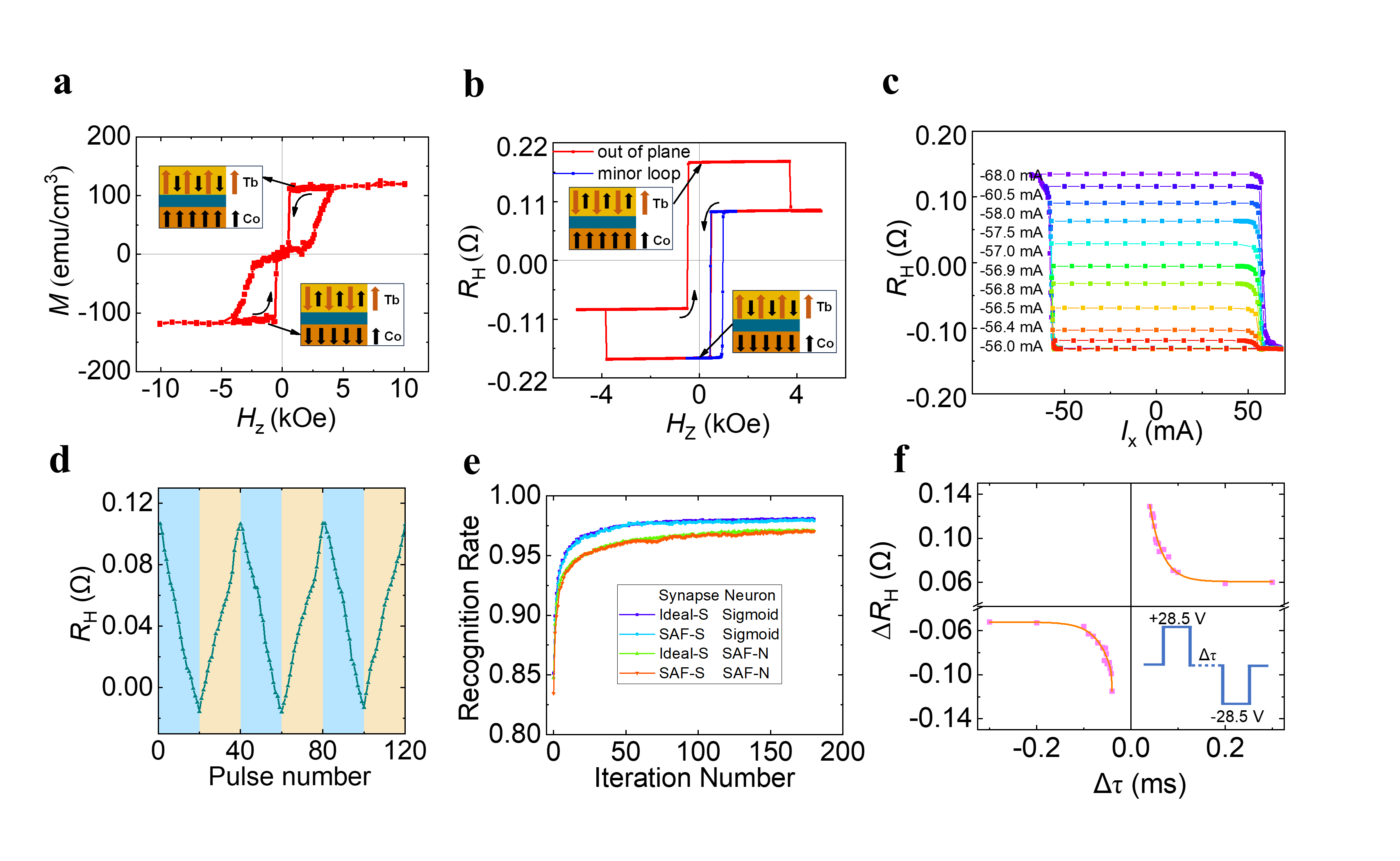 为此目的,公司自旋电子学团队设计并成功制备了强层间反铁磁耦合的Pt/CoPt/Ru/CoTb人工合成反铁磁异质结,实现了以下功能:(1)、同时实现了室温下磁矩补偿和剩磁态反常霍尔电阻的增强;(2)、通过倾斜溅射(Pt/CoPt层),打破异质结面内结构空间反演对称性,实现了无外磁场条件下自旋轨道矩驱动的确定性磁化翻转;(3)、获得非易失、线性、且均匀对称变化的多电阻态,成功模拟突触可塑性以及神经元非线性sigmoid激活函数,并进一步构建了全连接神经网络,实现对手写数字高达97.0-98.1%的识别率;(4)、成功模拟突触的时间依赖可塑性,并构建了脉冲神经网络,对手写数字进行无监督自适应学习,识别准确率达到87%。该研究工作表明霍尔信号增强的人工合成反铁磁异质结在高识别率、低功耗的神经形态计算硬件方面有很好的应用前景。