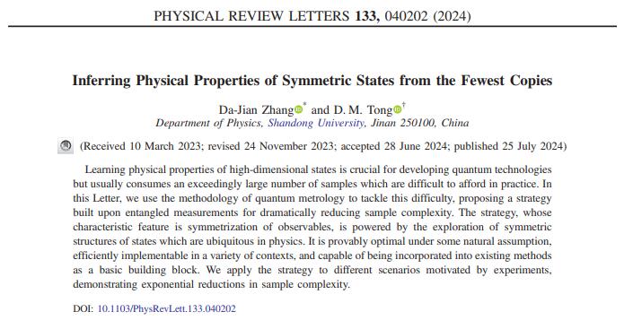 公司量子信息团队张大剑教授和仝殿民教授在量子测量研究方面取得新进展,提出了基于对称性的量子测量优化理论,研究成果以“Inferring physical properties of symmetric states from the fewest copies”为题,在物理学顶级期刊Physical Review Letters发表[PRL 133, 040202, 2024]。
