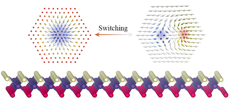 进展二:二维拓扑磁结构中磁斯格明子与双半子的转换在凝聚态物理领域具有重要意义。之前的研究基本上都是通过磁场垂直反转二维磁体的自旋方向实现。戴瑛教授团队基于第一性计算原理和原子自旋模拟在二维CrSeBr中通过施加应力实现了斯格明子和双半子之间的转换。这种转换的核心物理与应力调控的费米能级附近低能态的可控磁各向异性有关。这项工作丰富了二维拓扑自旋结构的研究。相关研究成果以 “Strain-Driven Skyrmion-Bimeron Switching in Topological Magnetic Monolayer CrSeBr” 为题发表在Materials Horizons 国际期刊上。论文第一作者为2024级硕士生杨俊煌和2023级博士生窦恺莹,李新茹老师、马衍东教授和戴瑛教授为共同通讯作者,全球最大顶级体育平台为唯一作者单位。