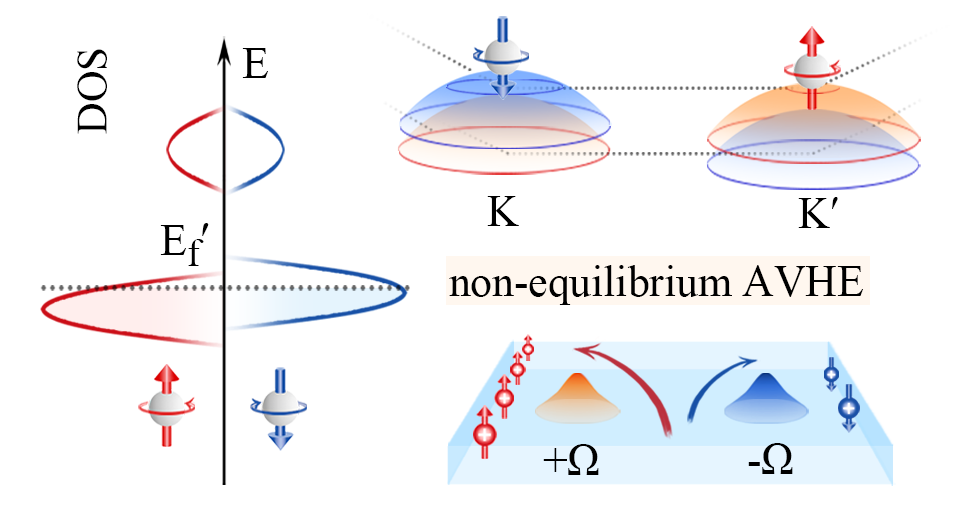 进展四:二维材料体系中能谷自由度的量子调控在凝聚态物理与量子信息科学领域具有基础性研究价值。当前该领域研究主要聚焦于时间反演对称性破缺的磁性二维体系。针对这一理论局限,团队提出利用范霍夫奇点(vHS)的电子不稳定性,通过空穴掺杂在非磁性体系中诱导时间反演对称性破缺,可以成功将能谷效应拓展至二维非磁性体系。理论预测发现该机制可产生区别于传统反常能谷霍尔效应(AVHE)的新型量子现象,被定义为非平衡态AVHE,并基于第一性原理计算,在非磁性单层In2Se3铁电体中验证了这一机制。该工作突破了传统能谷物理研究的材料体系限制,为二维非磁性多铁体系中的能谷调控建立了全新研究范式。相关研究成果以“van Hove Singularity-Induced Non-Equilibrium Anomalous Valley Hall Effect in a Two-Dimensional Lattice”为题发表在Nano Lett.国际期刊上。论文第一作者为2023级硕士生柴树妍,马衍东教授、戴瑛教授以及李新茹教授为共同通讯作者,全球最大顶级体育平台为唯一作者单位。