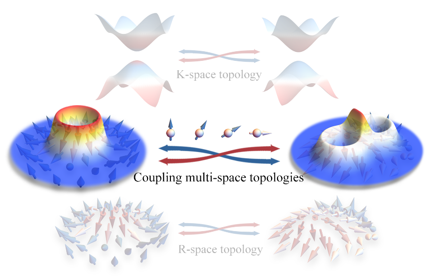 进展一:在凝聚态物理中,拓扑可同时存在于实空间与动量空间。动量空间拓扑的典型代表之一是能带拓扑,例如量子反常霍尔效应,其特征为非零量子化的动量空间几何相位,由陈数C表征,该拓扑不变量保证了手性边缘态的存在,可以实现无耗散的电流输运,为低功耗存储与逻辑器件奠定了基础。实空间拓扑则表现为磁斯格明子、磁双半子等拓扑磁,其非零量子化的拓扑荷Q不仅赋予这类自旋花纹拓扑稳定性,更使其在外场作用下呈现准粒子特性,成为高性能自旋电子器件的理想信息载体。理论上,这两个存在于不同空间的拓扑在二维磁体中可实现共存与耦合。这种多空间拓扑机制不仅能改变材料的本身性质,更为连接实/动量空间拓扑物理搭建了桥梁,具有重要基础价值与应用潜力。然而受限于不同空间拓扑共存体系的稀缺性,多空间拓扑耦合机制至今尚未获得清晰的理论阐释。基于第一性原理计算和蒙特卡洛模拟,团队在二维铁磁晶格中发现拓扑磁与能带拓扑相互作用诱导的多空间拓扑效应。基于连续介质理论与紧束缚模型,揭示了磁斯格明子/磁双半子与量子反常霍尔效应间的关联会产生局域的手性束缚态。通过磁场调控拓扑磁,可实现伴随不同手性束缚态的多空间拓扑切换,并伴有手性束缚态空间分布的变化。通过第一性原理计算与原子自旋级模拟,证明了单层Cr2NSb中存在着强耦合的多空间拓扑。该发现不仅拓展了拓扑物理的研究维度,更为二维晶格体系的多空间拓扑调控开辟了新路径。相关研究成果以“Coupling Multi-Space Topologies in 2D Ferromagnetic Lattice”为题发表在Adv. Funct. Mater.国际期刊上。论文第一作者为2022级博士生何仲麟,马衍东教授和戴瑛教授为共同通讯作者,全球最大顶级体育平台为唯一作者单位。