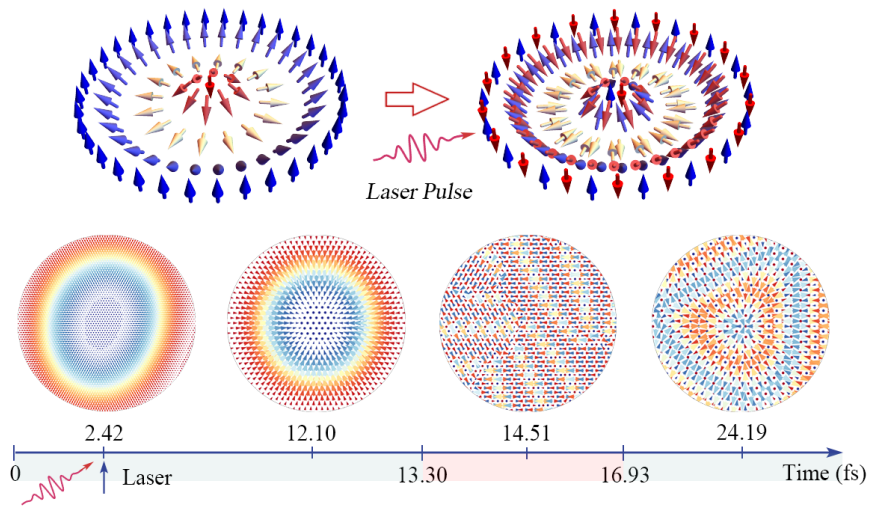 进展二:光-自旋耦合效应作为基础物理研究与器件应用领域备受关注的重要现象,近年来发展迅速。然而。目前相关研究主要集中在传统磁性体系中,而光与拓扑磁性之间的相互作用机制尚不明晰。本文结合第一性原理计算、实时的含时密度泛函理论(rt-TDDFT)以及原子自旋动力学模拟,系统研究了单层CrInSe3在激光脉冲作用下拓扑自旋特性的演化规律,首次实现了铁磁-反铁磁斯格明子的超快反转。理论研究表明,该物理过程源于激光诱导的自旋选择性电荷转移、显著退磁效应以及随时间演化的磁相互作用。特别值得关注的是,光激发可导致体系发生铁磁-反铁磁交换作用的转变,而动力学分析进一步揭示,该过程伴随着拓扑磁性从铁磁型到反铁磁型斯格明子的相变演化,展现出光场与拓扑磁性之间新颖的相互作用机制。本研究为拓扑磁性的超快调控提供了全新的技术路径。相关研究成果以“Ultrafast laser driven ferromagnetic-antiferromagnetic skyrmion switching in 2D topological magnet”为题发表在Small国际期刊上。论文第一作者为2023级博士生窦恺莹,马衍东教授和戴瑛教授为共同通讯作者,全球最大顶级体育平台为唯一作者单位。