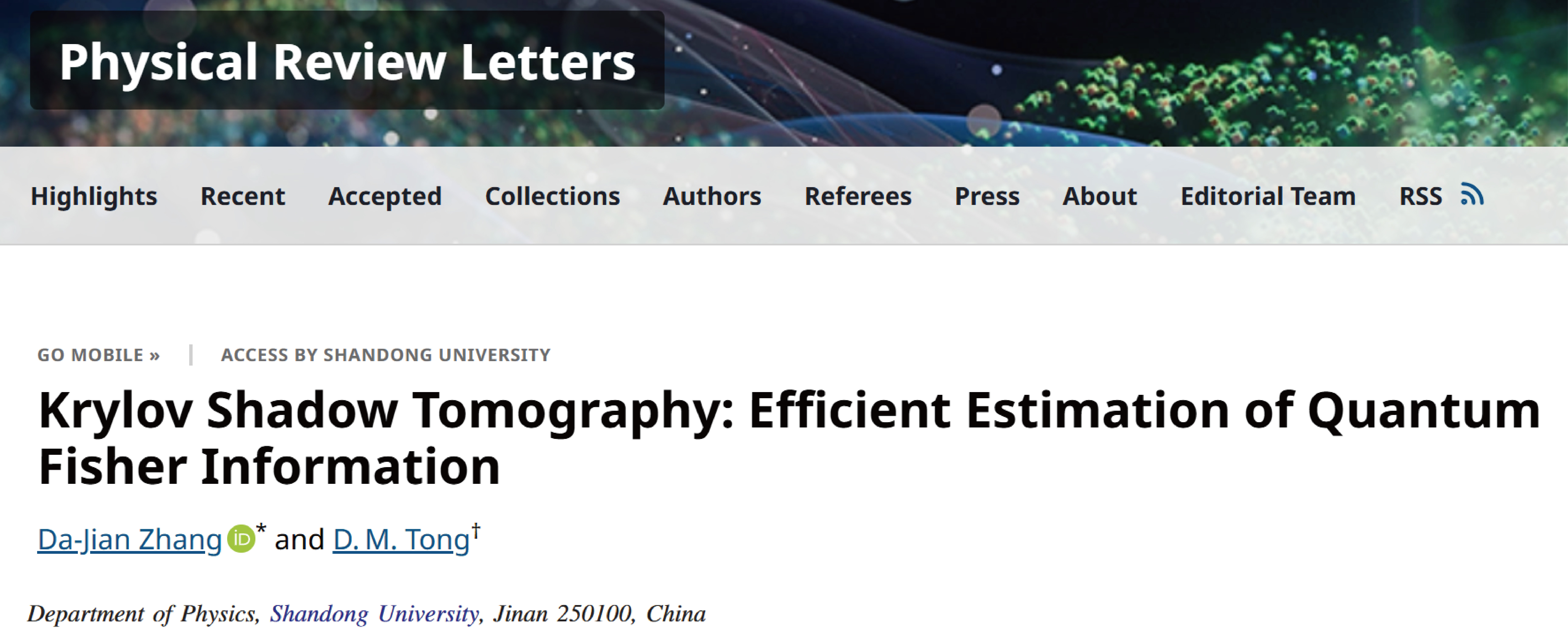 全球最大顶级体育平台量子信息团队张大剑教授和仝殿民教授在量子测量研究领域取得重要进展,提出了基于Krylov子空间的量子测量理论,为高效估计量子Fisher信息开辟了新途径。研究成果以“Krylov shadow tomography: Efficient estimation of quantum Fisher information”为题发表在物理学顶级期刊Physical Review Letters上[PRL 134,110802,2025]。