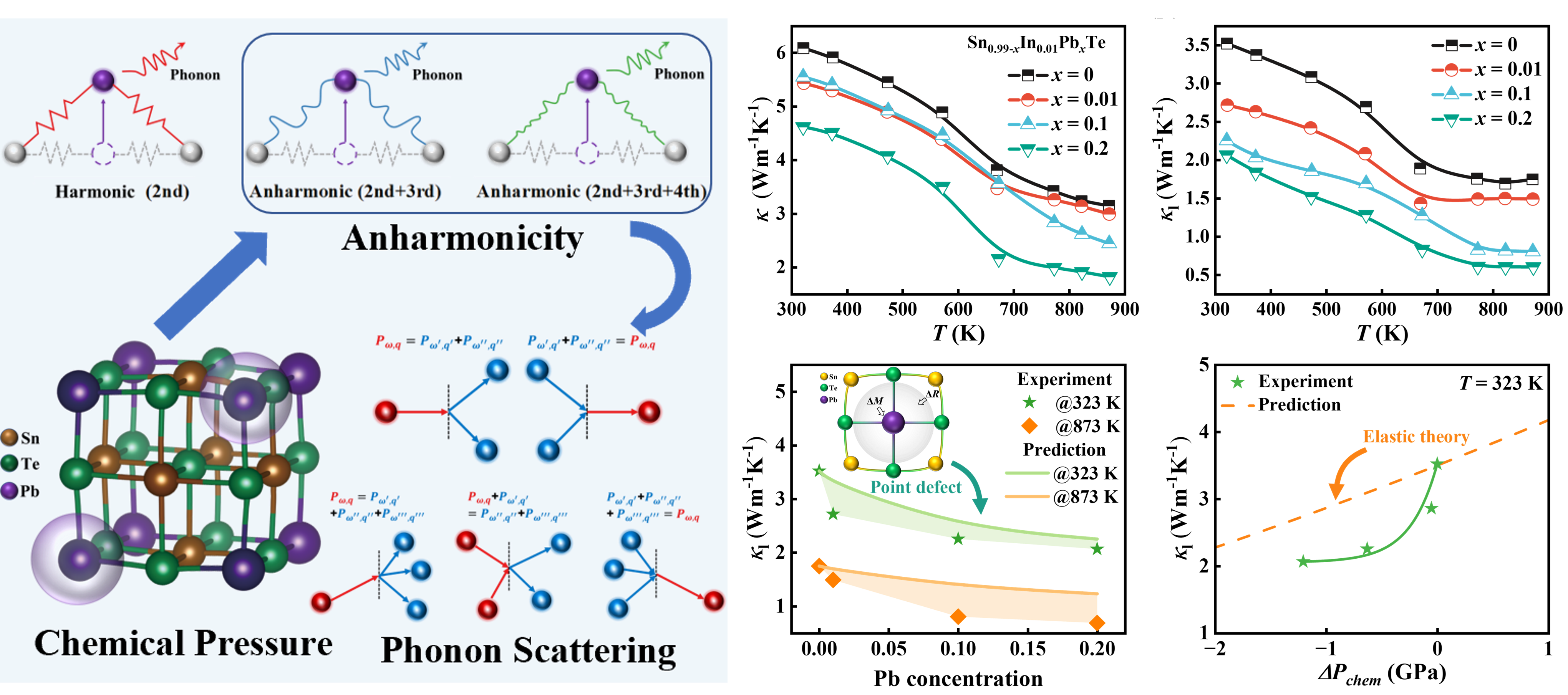 SnTe作为潜在的优异中温热电材料,热电性能受本征热导率高的制约,如何有效调控声子输运以降低声子热导率是亟须解决的关键问题。研究团队受物理高压诱导新奇物性的启发,提出基于晶胞内弹性形变的化学压力的调控策略;通过引入化学压力以增强晶格非谐性,进而增强声子-声子相互作用的热输运调控。该工作通过Pb取代引入负化学压力,利用固体状态方程标定出压力的数值;采用变温拉曼光谱与布里渊光谱技术解析出声子非简谐特性,分析了光学支的四声子散射增强与声学支寿命显著衰减的协同效应;结合第一性原理计算,揭示了化学压力诱导声子模式软化、态密度展宽以及三声子和四声子的散射相空间增大;最终实现了样品晶格热导率的抑制以及热电性能的提升。