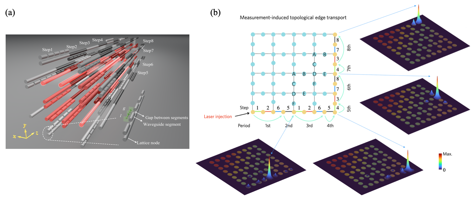 图1 测量诱导的光子拓扑绝缘体。 (a) 片上集成的光波导结构图,(b) 测量诱导的拓扑边界传输。