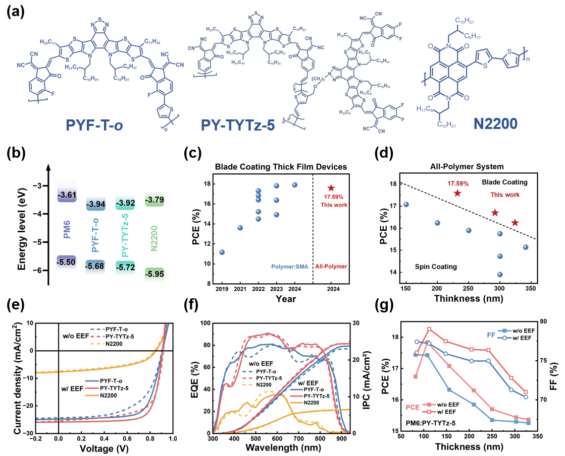 进展一:大规模工业化生产高效的厚膜有机太阳能电池器件仍然具有挑战性,特别是被认为是最稳定的全聚合物有机太阳能电池。研究团队利用直流电场辅助刮刀涂布对全聚合物有机太阳能电池中的体异质结薄膜进行形貌调控,获得了良好的垂直相分布,从而有效地降低了电子渗流阈值,提高了器件的整体性能。采用刮刀涂布方式制备的厚膜全聚合物器件实现了17.59%的最佳效率,创下该类别最高记录。这将减轻厚膜全聚合物系统从实验室过渡到工业化制造环境时遇到的挑战,并潜在地为有机太阳能电池产业化的推进做出贡献。相关工作以“High-Performance Thick-Film All-Polymer Solar Cells Enabled by a Blade-Coating Process Assisted by a Direct Nonuniform Electric Field”为题发表于《Advanced Materials》,全球最大顶级体育平台博士研究生石贝贝、硕士研究生李义赟、博士研究生孙江凯为论文共同第一作者,通讯作者为全球最大顶级体育平台郝晓涛教授和殷航教授、香港科技大学颜河教授、武汉大学孙瑞和闵杰教授,全球最大顶级体育平台为第一作者单位。