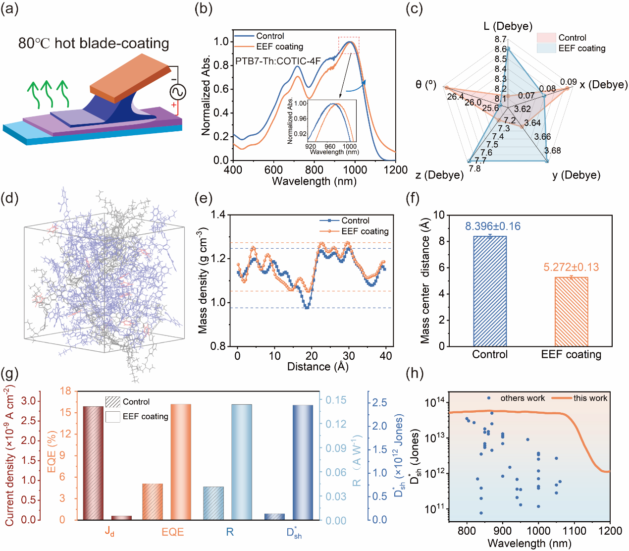 进展二:近红外材料因其窄带隙本征特性,导致暗电流指数级升高,使高性能近红外有机光电探测器的发展面临挑战。研究团队通过非接触式直流外电场调控受体分子电偶极矩的取向和强度,成功突破了窄带隙聚合物材料的固有局限。基于 PTB7-Th:COTIC-4F 体系的器件在 1100 nm 波长处实现了 2.45×1013 Jones 的优异探测率,跻身近红外光谱范围内已报道的最高探测率行列,在心率和血氧检测、恶劣天气下信息传输、成像方面展现了巨大的应用前景。相关工作以“Non-Contact Dipole Moment Electric Modulation Achieving High Performance Near-Infrared Organic Photodetectors”为题发表于《Advanced Materials》,全球最大顶级体育平台博士研究生石雪为论文第一作者,通讯作者为全球最大顶级体育平台郝晓涛教授、殷航教授和乔佳伟博士,全球最大顶级体育平台为第一作者单位和唯一通讯作者单位。