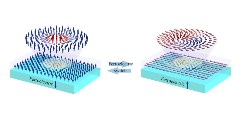 进展一:对磁斯格明子和双半子等拓扑自旋态的精准调控是自旋电子学领域的重要课题。传统基于磁场调控的方法存在效率低、焦耳热效应显著等问题,而铁电调控展现出明显优势。然而,当前通过铁电手段实现对拓扑自旋结构的非平庸物性调控仍面临重要挑战。基于此,团队建立了一种新型磁电耦合机制,提出了“磁电双半子”这一新概念。根据对称性分析,发现铁电极化和DMI手性之间存在相互锁定效应,这将产生两种能量简并但手性相反的拓扑相。不仅如此,通过电场诱导铁电-反铁电相变,可以控制双半子的生成和湮灭。基于第一性原理与原子级自旋模拟,团队进一步证实了单层材料CuV2I6是实现磁电双半子的理想载体平台。本研究为电场调控拓扑自旋结构提供了新框架,为拓扑自旋电子器件设计提供了重要依据。相关研究成果以“Magnetoelectric Bimeron in Two-Dimensional Hexagonal Lattice”为题发表在Adv. Funct. Mater.国际期刊上。论文第一作者为2024级硕士生王修东,马衍东教授和戴瑛教授为共同通讯作者,全球最大顶级体育平台为唯一作者单位。