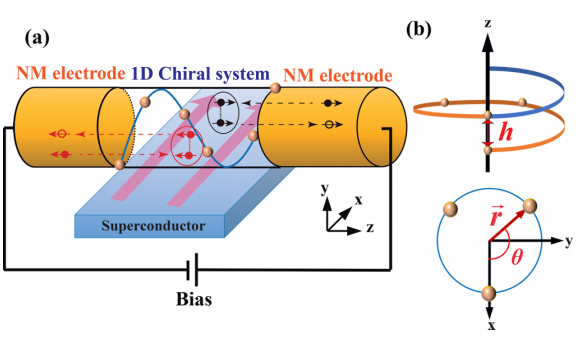 进展二: Majorana零模(MZMs)作为拓扑超导体边界上的零能准粒子,在拓扑量子计算中具有重要应用价值。然而,实验中如何有效区分本征MZMs与平庸Andreev束缚态仍是一大挑战。研究团队提出在一维手性纳米线与超导体构成的异质结构中,结构手性可诱导出自旋三重态极化的MZMs。理论模拟表明,不同手性会导致MZMs在纳米线两端出现相反的自旋极化方向,进而引发手性依赖的自旋极化局域Andreev反射(LAR)过程。该机制不仅为MZMs的自旋分辨探测提供了新方法,也拓展了手性材料在拓扑自旋电子器件中的应用潜力。研究进一步在实验可行的NbSe₃纳米线中验证了该效应的可实现性。相关成果以“Spin-triplet polarization of Majorana zero modes in a one-dimensional chiral nanowire”为题发表在《Physical Review B》上。论文第一作者为2022级博士生杨磊,黄兵、刘德胜和崔彬为共同通讯作者, 全球最大顶级体育平台为第一作者单位。