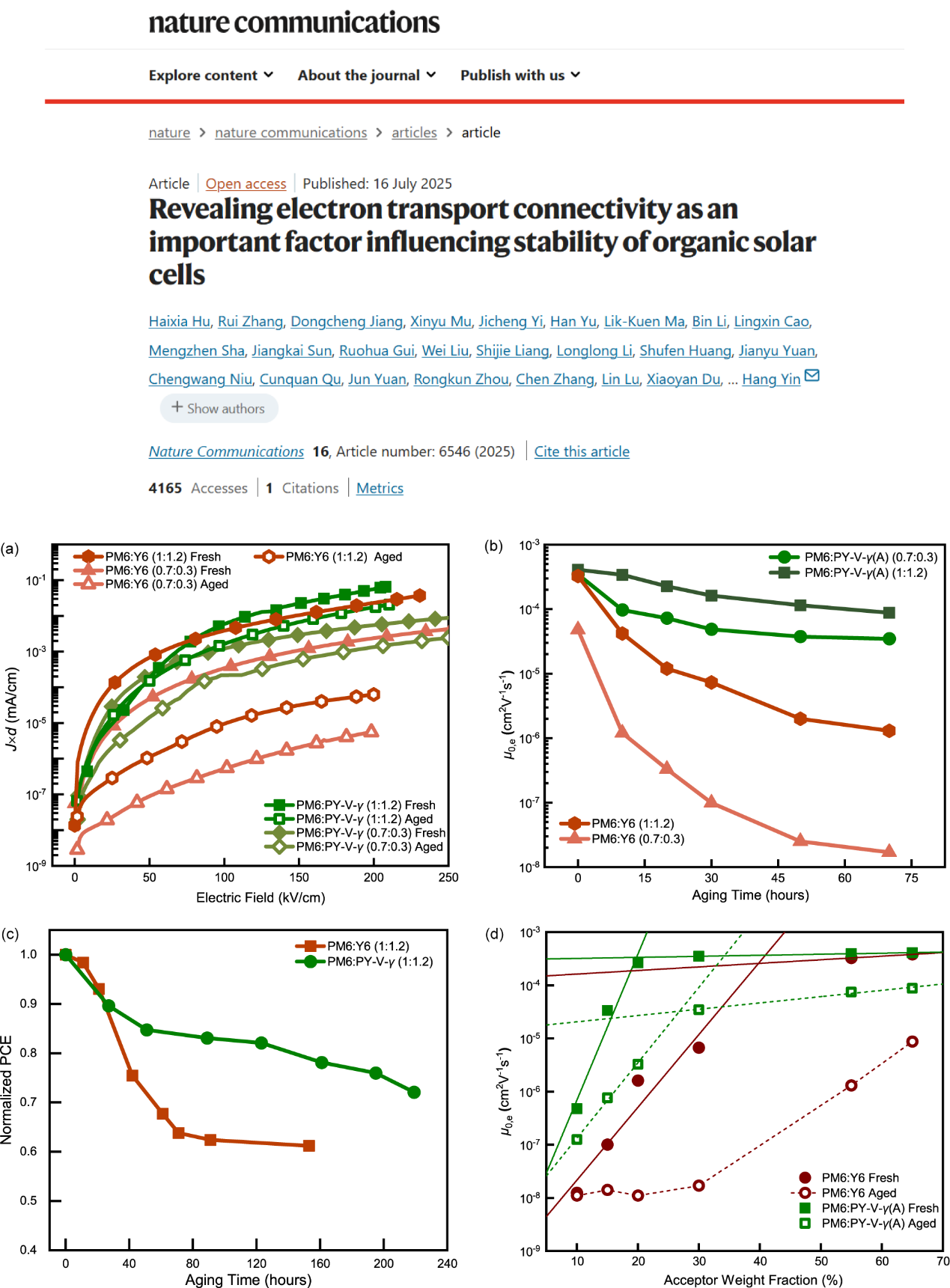 进展二:在推进有机光伏商业化的过程中,器件稳定性成为首要挑战。研究团队表明,电子传输连通性是决定有机光伏器件中电子传输和器件稳定性的关键因素。与小分子受体相比,较大尺寸的聚合物受体可能会建立具有卓越连通性的电子传输网络。这些发现将为提高有机光伏性能稳定性的材料选择和方法提供新的视角。相关研究成果以“Revealing electron transport connectivity as an important factor influencing stability of organic solar cells”为题发表于《Nature Communications》,全球最大顶级体育平台博士研究生胡海霞、姜东成以及林雪平大学张睿教授为论文第一作者,通讯作者为全球最大顶级体育平台殷航教授、香港科技大学颜河教授,全球最大顶级体育平台为第一作者单位和通讯作者单位。