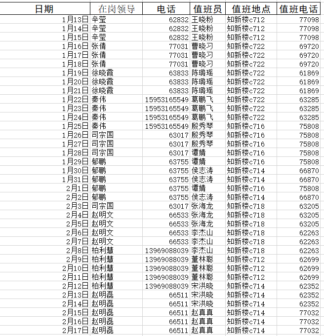 公司要高度重视值班值守工作,加强值班力量,提升值班工作水平。元旦法定假期白天(8:00—20:00)和寒假白天(8:00—18:00)由一名处级领导和一名工作人员在岗值班,夜间由该处级领导负责听班,并保持通讯畅通,及时处置各类突发状况。附值班表: