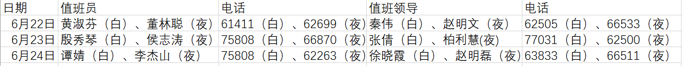 严格落实值班值守工作要求。公司安排处级干部和工作人员各一人24小时在岗值班。放假期间严格落实每日情况“零报告”,如遇有突发情况及时响应、妥善处置,遇重大敏感事项、紧急事项第一时间报告,不得漏报、迟报、瞒报。值班情况如下: