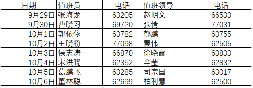 四、做好应急值守。放假期间,公司要切实做好应急值守工作。公司安排处级干部和工作人员各1人每天8:00-20:00在岗值班、夜间听班。假期严格落实“零报告”制度,如遇突发情况及时响应、妥善处置,第一时间报告。附值班表:
