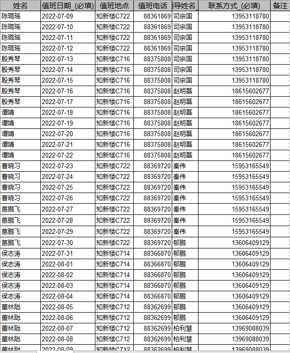 公司每天安排1名处级领导和1名工作人员白天(8:00-18:00)在岗值班,夜间(18:00-次日8:00)在校区驻地负责听班。附值班表如下: