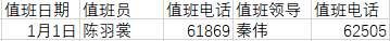 公司按照公司的统一部署,结合公司工作实际, 统筹做好年度总结、期末考试组织、走访慰问等年末各项工作。假期前加强安全教育,师生离开公司驻地要严格执行请销假制度。认真开展安全生产和自然灾害风险隐患排查,完善细化应急预案,做好应急处置准备。严格落实值班值守工作要求,确保联络畅通,突发事件报告、紧急事务处理及时到位。值班表如下: