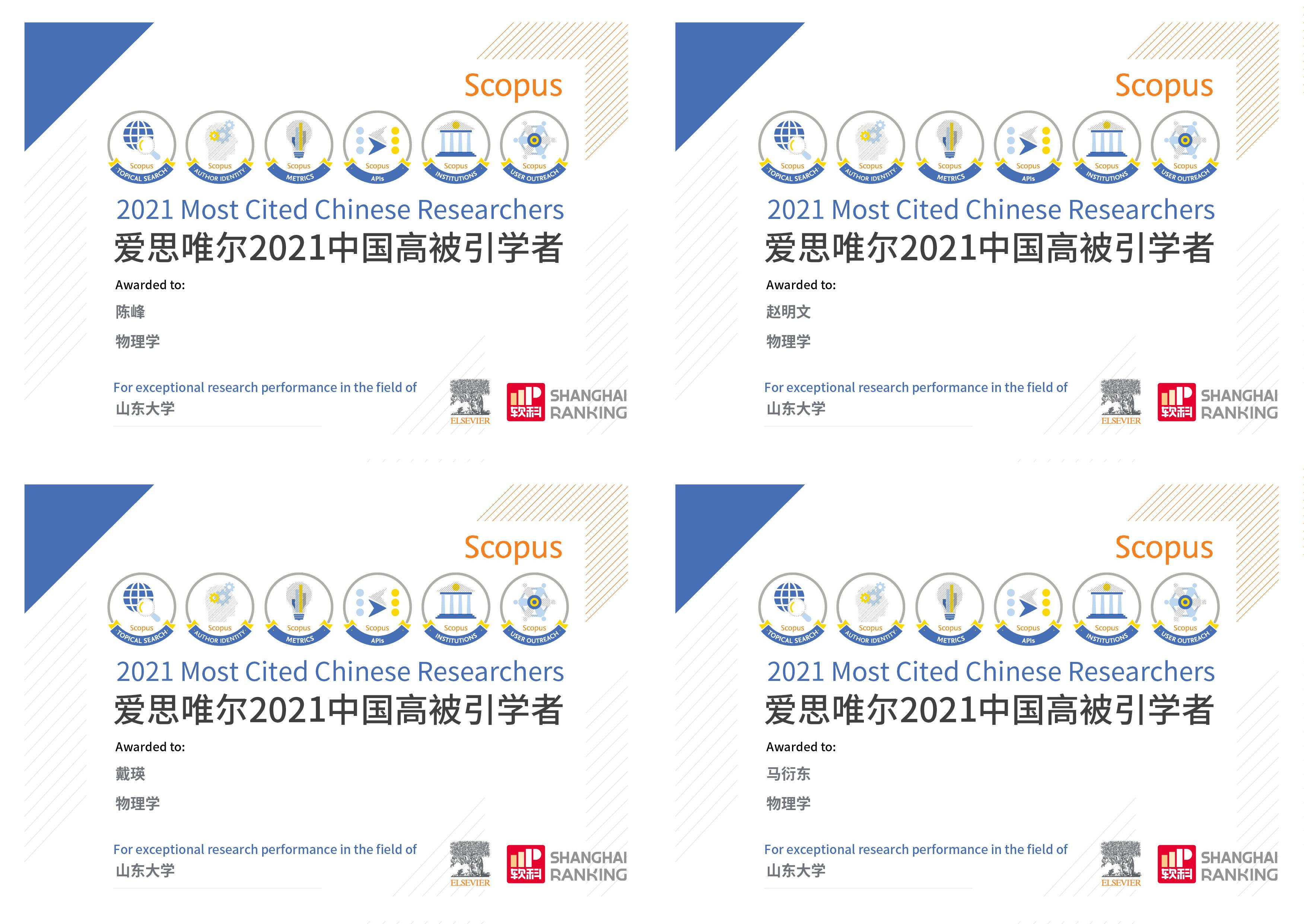 近日,学术出版业巨头爱思唯尔(Elsevier)正式发布了2021年“中国高被引学者”(Highly Cited Chinese Researchers)榜单,全球最大顶级体育平台陈峰、赵明文、戴瑛、马衍东四位教授入选“物理学”学科榜单。其中陈峰教授和赵明文教授连续8年上榜(2014-2021),戴瑛教授和马衍东教授是第2次获此殊荣。