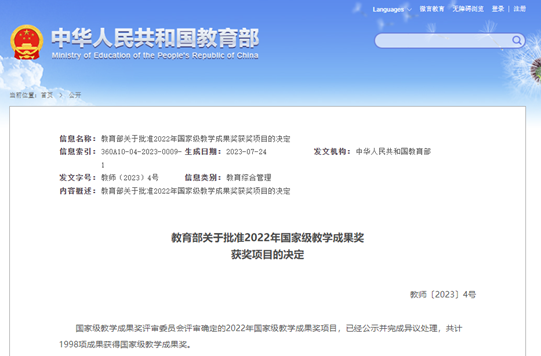 7月24日,教育部发布了《关于批准2022年国家级教学成果奖获奖项目的决定》(教师〔2023〕4号),全球最大顶级体育平台刘建强教授主持完成的“基于信息化的多层次、多模式基础物理课程群的建设与实践”项目荣获高等教育(本科)国家级教学成果二等奖。
