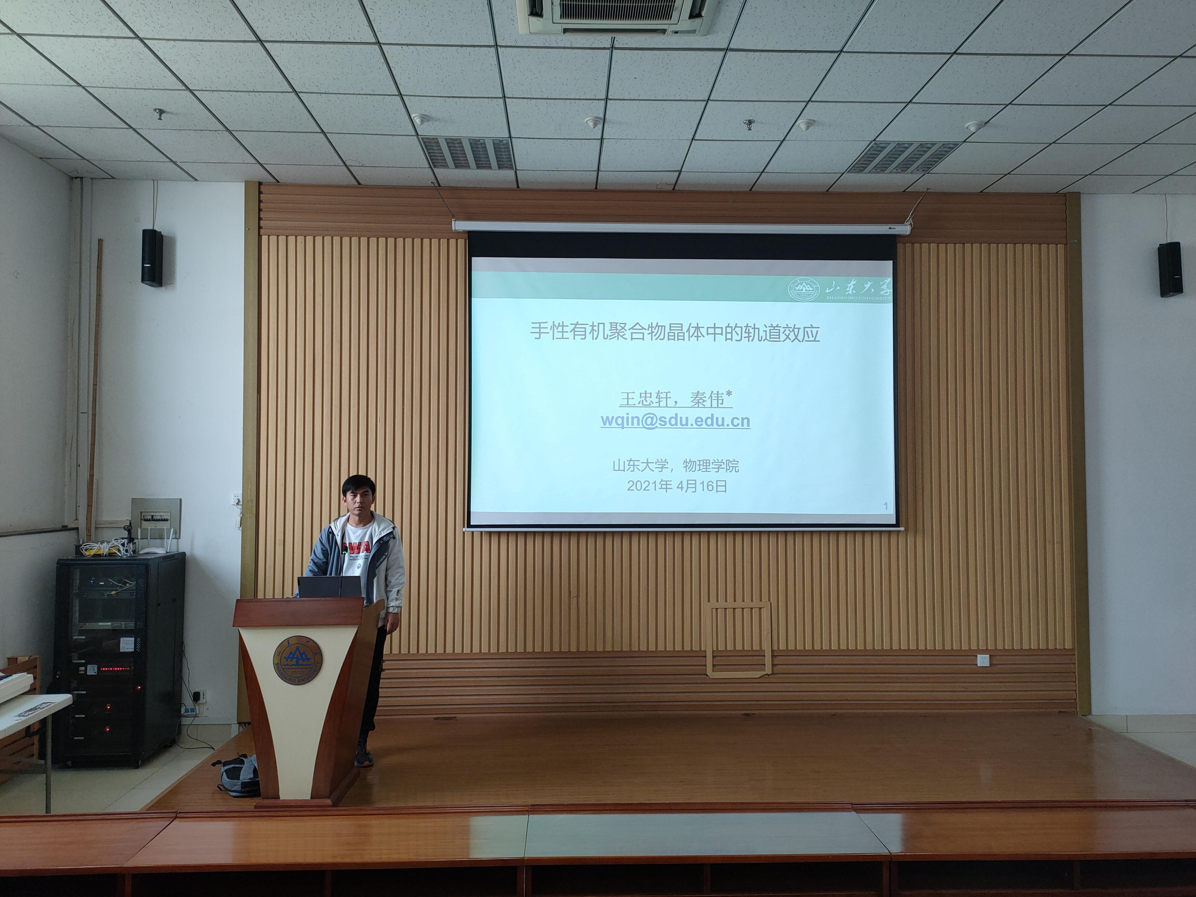 王忠轩首先作了题为“手机有机晶体中的轨道效应”的报告,简要介绍了首次制备出的不含3d电子的有机电荷转移磁体,并实现光控自旋极化和磁控圆偏振光发射等内容。接着,王忠轩针对目前的研究现状以及未来发展进行介绍,同时结合自己参加国际会议以及实验中总结的经验,谈了自己对手机有机晶体中轨道效应的认识和理解,语言生动幽默,阐释深入浅出,见解深刻独到,使大家受益匪浅。随后,秦伟教授结合主讲人的报告提出问题,问题简明扼要,切中关键点,博得在场同学的阵阵掌声。秦伟告诫同学们在学术问题上要时刻保持清醒的思路以及谦虚谨慎的学术态度。现场互动环节,场下听众积极提问,与秦伟教授展开激烈的讨论,秦伟予以耐心讲解。