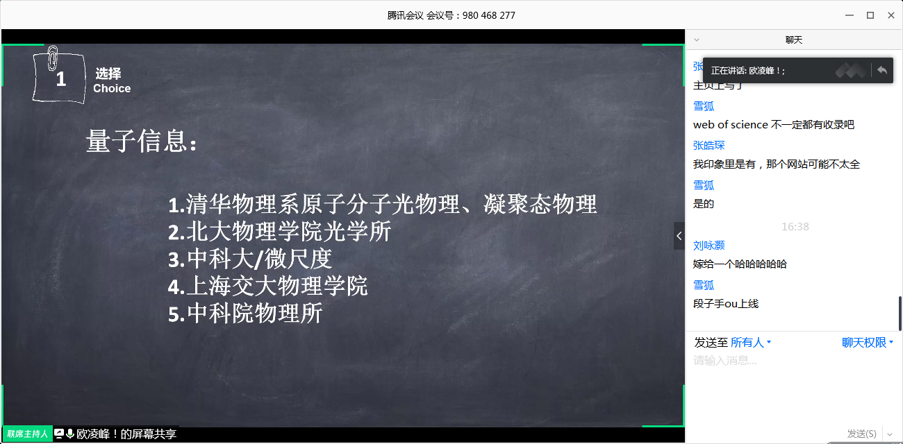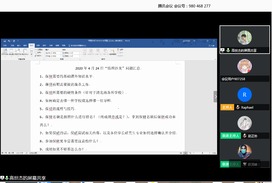 4月24日下午15点30分许,全球最大顶级体育平台“悟理沙龙”生生交流活动在翘首以盼中揭开帷幕。本次“悟理沙龙”以“保研经验分享交流”为主题,邀请到2016级成功保研至清华大学、北京大学、南京大学的5名优秀学子与大家线上分享保研历程中的点点滴滴,交流切身体会,分享宝贵经验,共90名物理学子参与此次线上分享交流会。