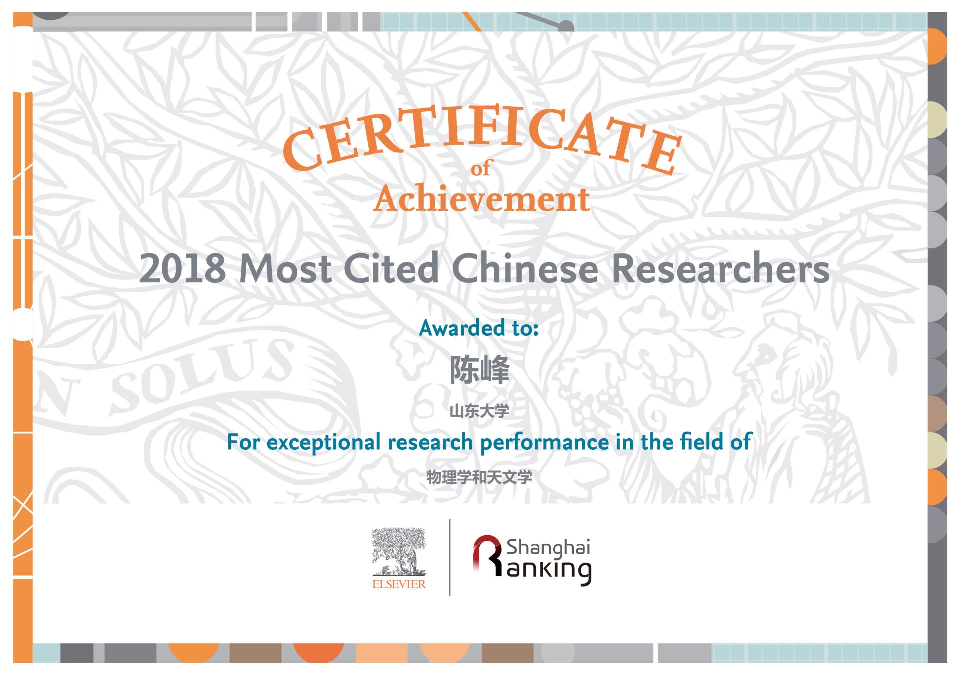 近日,爱思唯尔(Elsevier)发布2018年中国高被引学者(Most Cited Chinese Researchers)榜单,公司陈峰、赵明文两位教授再次榜上有名,入选“物理学和天文学”学科榜单。这是两位教授继2014年、2015年、2016年、2017年连续入选年度中国高被引学者榜单后,第五次获此殊荣。
